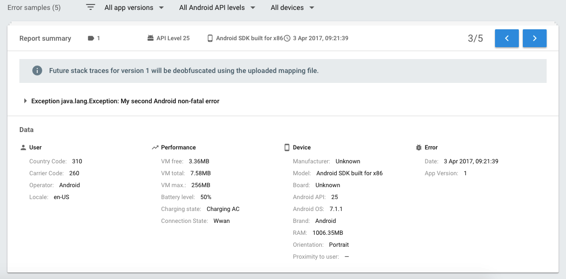 This screen also contains an ‘Error samples’ section where you’ll find the full stack trace, plus some very specific details about the smartphone or tablet where this error was recorded – right down to whether the device was connected to Wi-Fi at the time, and how much battery it had remaining.