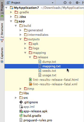 Once you have your signed APK, make sure Android Studio’s ‘Project’ view is selected, and then open the app/build/outputs/mapping/release directory – you’ll find the mapping file inside.