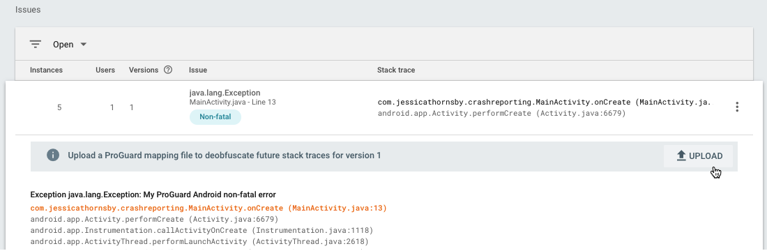 - Scroll to the ‘Issues’ section and click any issue associated with the version of your app that generated this mapping file. Click the ‘Upload’ button.