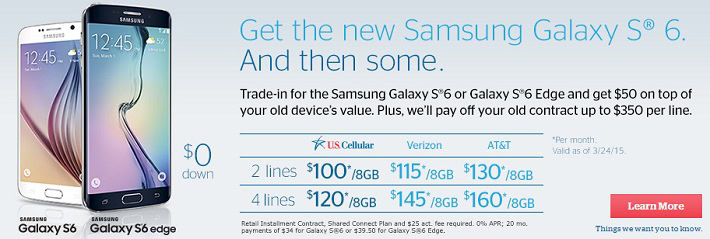 UScellular carries both the Galaxy S6 and S6 Edge, but only in white or black with storage options of only 32 or 64GB. On-contract Galaxy S6 pricing is set at $199.99 for 32GBs, or $299.99 for 64GBs. Outright pricing is $680 and $770 respectively.