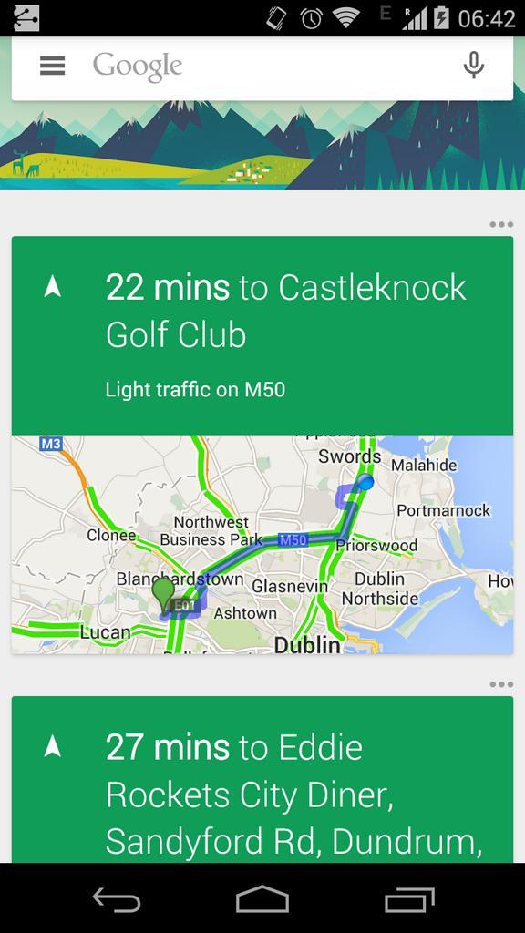 So what’s new here? First, there’s a hamburger menu on the left side, something that currently doesn’t exist in Google Now. It’s unclear what the purpose for it is, but given its presence in the search box we’d guess it allows you to select different types of searches like images, videos and so forth. Some of the other changes include the new placement of the overflow menu outside of the individual Now cards, and it’s possible that the green-hued cards are also part of the Material Design makeover.