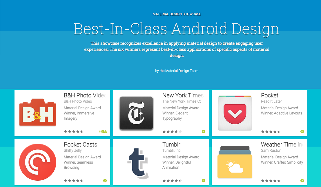 In addition to the updated Google Design webpage, Google has also revealed a list of the best applications available right now with great Material Design implementation. A total of 18 apps are on the list, including well-known apps like Tumblr, Pocket Casts, Weather Timeline, and lesser-known apps like Telegram, SeriesGuide and wiMAN Free WiFi Unlocker. If you’d like to see the full list, be sure to head to the Play Store link below!