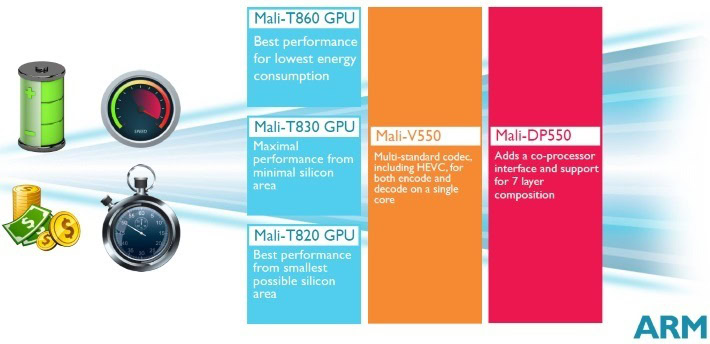 The five new media processors are: the Mali-T820 GPU, the Mali-T830 GPU, the Mali-T860 GPU, the Mali-V550 video decoder, and the Mali DP-550 display processor. And as you would expect, all these designs are faster and offer more functionality than their predecessors, yet while remaining in the tight thermal budget needed for smartphones and tablets.