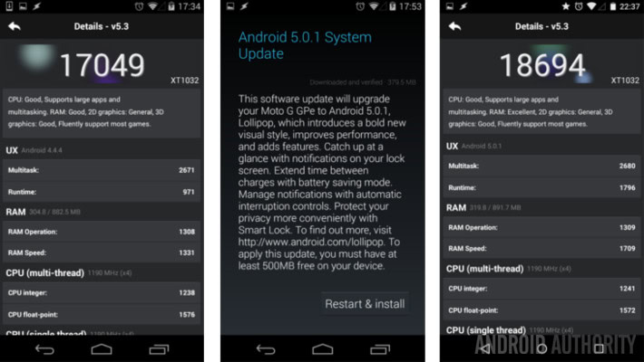 That’s right, Android 5.0.1 Lollipop on the original Moto G GPe produces a much higher benchmark score than Android 4.4.4 KitKat before it. Jumping from 17,178 (average of 3 runs) to 18,694 (one run only) is no small feat.