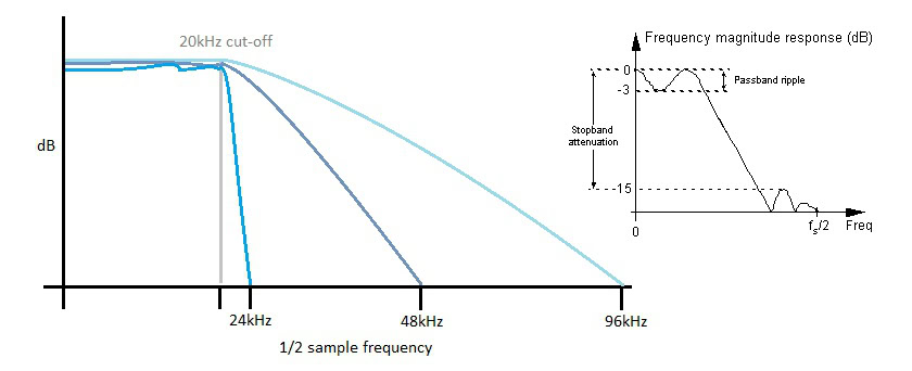 In the digital domain, similar rules apply for filters that are often used in the studio mixing process. Higher sample rates allow for steeper, faster acting filters that require additional data in order to function properly. None of this is required when it comes to playback and DACs, as we are only interesting in what you can actually hear.