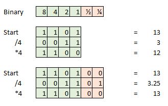 Here’s an example, say we take a 4-bit sample and our current sample is 13, which is 1101 in binary. Now attempt to divide that by four and we are left with 0011, or simply 3. We have lost the extra 0.25 and this will represent an error if we attempted to do additional math or turn our signal back into an analog wave form.