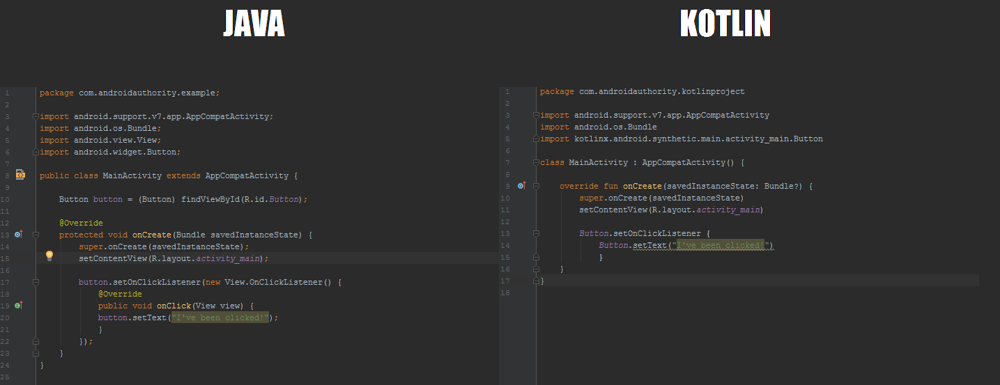 There are lots of useful extensions available for Kotlin, many of which can make life considerably easier for Android development. One particularly useful example is ‘Synthetic’, an extension that allows you to completely do away with typing findViewByID. Add one line of code and you’ll be able to access views directly with no need to use their IDs.