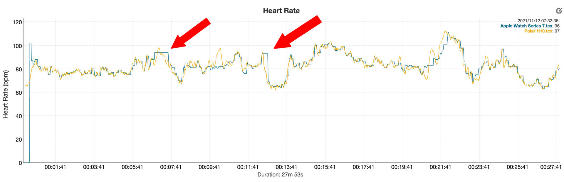We purchased a second Apple Watch Series 7 to see if we could get better data out of a different unit and rule out any one-off faults with the hardware. I had varying success with the replacement unit. Below is a 27-minute yoga session recorded with the second Series 7 and Polar H10.