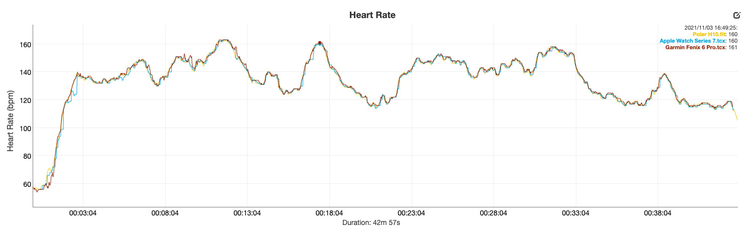 I was able to get some decent data out of the sensor, but only during an indoor cycling workout. Below, you’ll see a ~43-minute cycling workout with the Apple Watch Series 7 and Garmin Fenix 6 Pro strapped to my wrists, while the Polar H10 was strapped to my chest and broadcasting to a Garmin Venu 2. Take a look:
