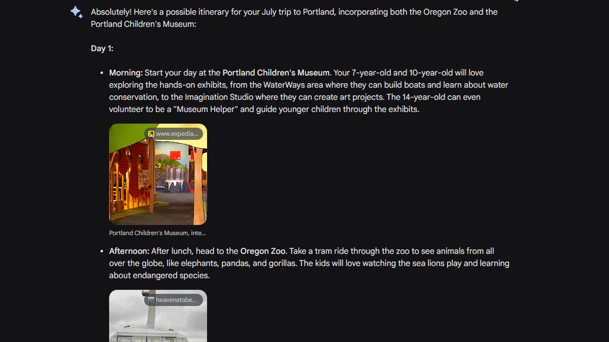 I asked it to correct the problem. Then I asked it about kid activities, with the same prompt as I would use with Bard. It gave me suggestions, and then I asked it to include the Children’s Museum and Oregon Zoo in the schedule.