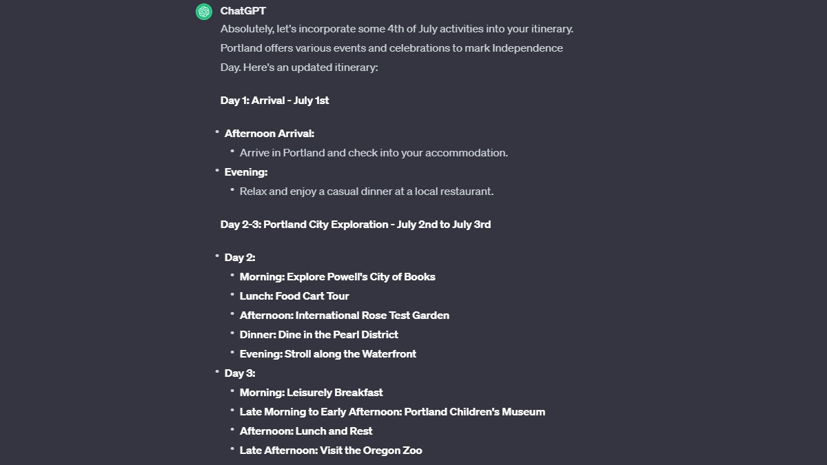 I asked it to address this, and it gave me a new form, but it had day 4 (July 4th) and Independence Day as two entries with different activities. No way I’m going to some waterfall outside of Portland and making it back for festivities on the same day! So I fixed this next. It spit me out a new schedule but removed the descriptions and went back to the vague format.