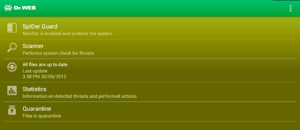 Unlike AVG and Lookout, when Dr. Web is installed it will not initially perform an automatic scan of previously installed apps, nor does it automatically switch on real time protection. However, once you manually update the virus database and enable the SpIDer Guard, Dr. Web behaves much like AVG and Lookout.