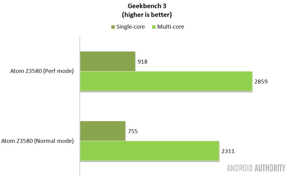 Interestingly we can see that the Atom actually performs better under this test when warmer! I mentioned previously that the Zenfone 2 had several different performance modes. I set the phone back to its “normal” mode and re-ran Geekbench to see what the difference in performance would be, the result was quite surprising:
