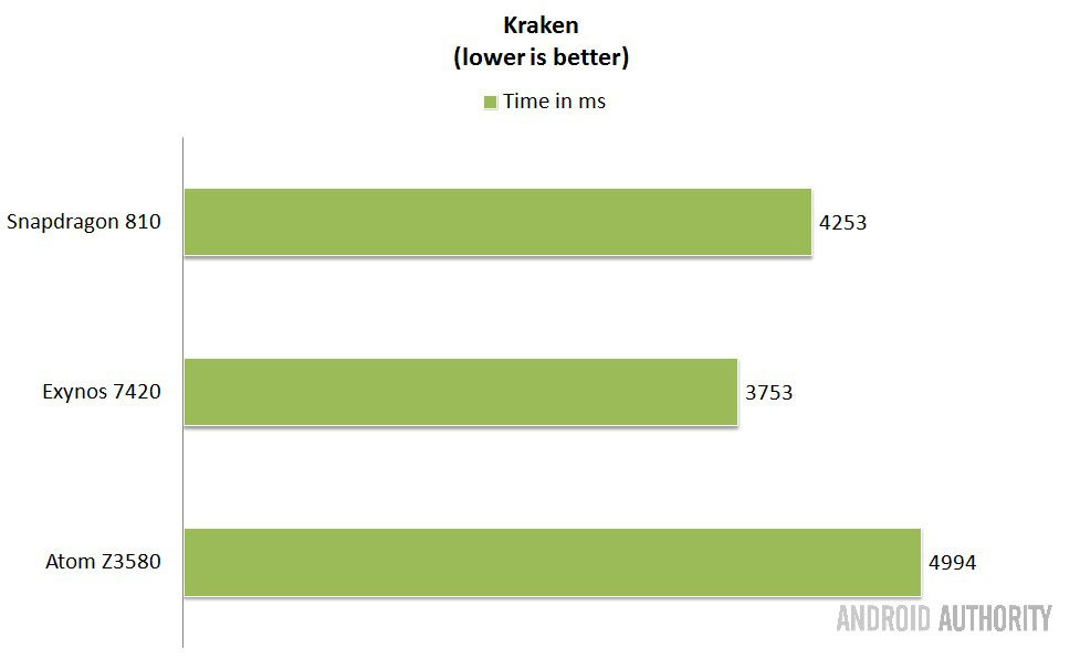 This is the one test that the Exynos 7420 didn’t win, it was beaten by the Qualcomm Snapdragon 810. However the real surprise was the lackluster performance of the Intel Atom SoC… Benchmarks are one thing, but this is how fast Javascript runs in your browser and browsing is one of the main activities we all do on our phones.