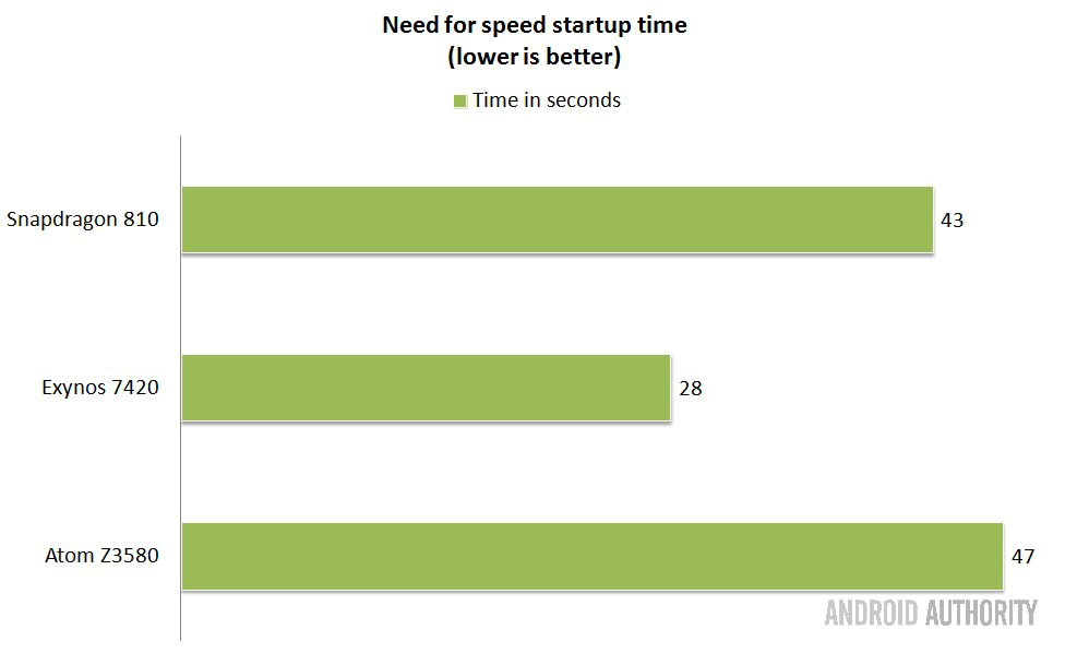 For something approaching real world usage I picked two tests. The first is how long does it take to startup the Need For Speed No Limits game, and secondly how well do the phones handle the Kraken Javascript benchmark. Kraken was created by Mozilla and measures the speed of several different test cases extracted from real-world applications and libraries. In each case, I used the same version of Chrome downloaded from the Play Store. But first, the Need for Speed startup times: