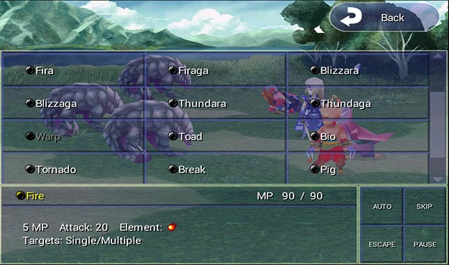 Furthermore, a few new battle commands have been added to the Final Fantasy 4 Android port. Once Auto-Battle is turned on, all of your characters will automatically attack enemies, and there’s a way of defining commands so everyone performs a different task. It’s a really handy feature for level grinding. Additionally, there are nearby buttons that will let you skip character turns and escape from the battle.