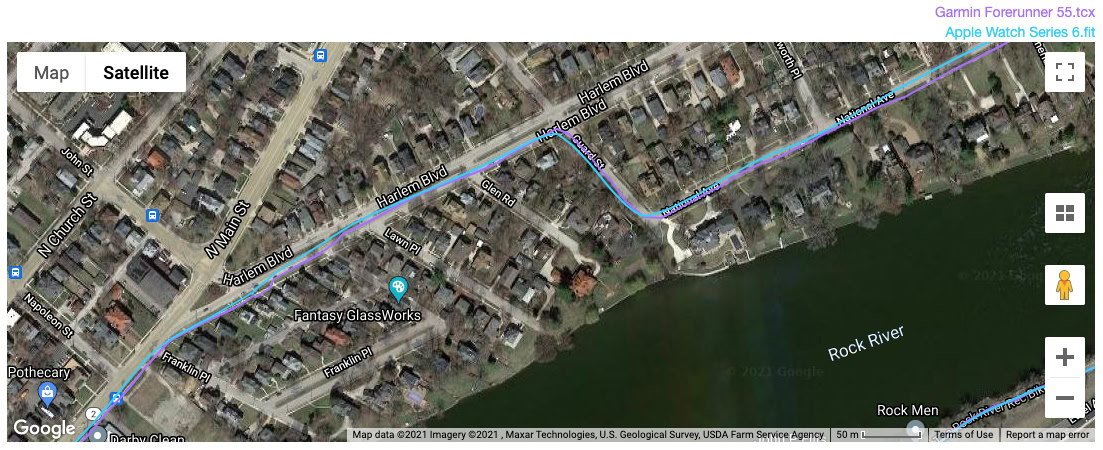 I ran the same route on another day with the Forerunner 55 (purple) and Apple Watch Series 6 (blue), which you can see above. It was cloudier this day, but both devices expectedly performed well. I’ll give the win to the Apple Watch in this case, as it was able to stick to the exact side of the road I was on nearly the entire time. The Forerunner 55 was no slouch either.