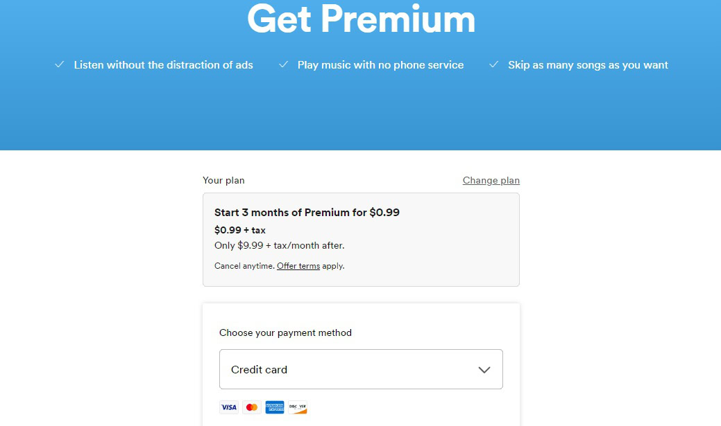 To sign up for the trial, you will need to enter your credit card info. This credit card will immediately be charged $0.99 (plus applicable tax) and eventually be charged the normal fee for Spotify Premium when the trial is over (unless you cancel before then).
