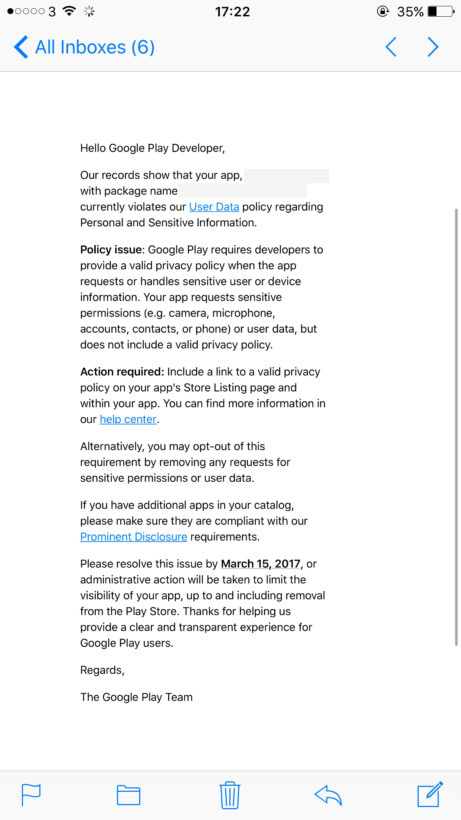 As you can see from the image above, the developers that are receiving this email from Google are lacking one thing: a privacy policy. Google is giving them until mid-March to fix it, or else the visibility of these apps might be restricted or they may be removed from the Play Store altogether, Google warns.