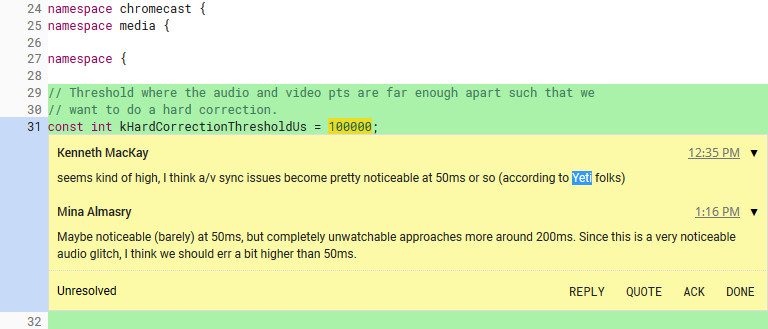 While the code and the messages there might seem confusing, it appears that what’s getting discussed here is the sync of audio and video elements connected to a Chromecast. Obviously, if the audio and video are not synced together it can be a real pain to watch media content — or play video games. Judging from this conversation here, it seems that the Yeti team has a preferred limit for how much audio and video can be out of sync before it becomes noticeable.