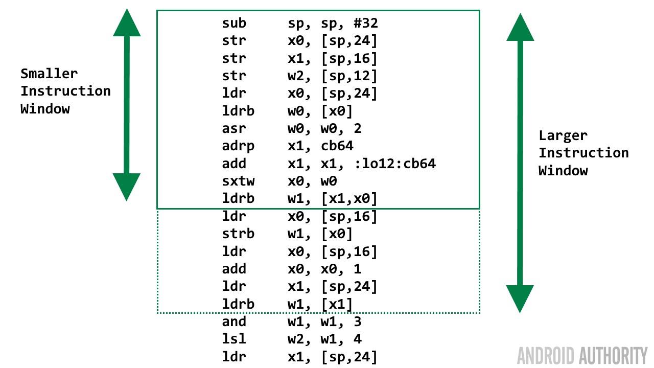 When looking for instructions to execute out of order, the CPU needs to scan ahead in the pipleline. How far ahead it scans is known as the instruction window. A larger instruction window gives a higher performance per clock cycle, a greater IPC. However it also means a greater silicon area and higher power consumption. It also presents problems for CPU designers as the larger the instruction window, the harder it is to get the internal timings right which means the peak clock frequency will be lower. CPUs with larger instruction windows need more internal resources. There needs to be more register renaming resources, the issue queues need to be longer and the various internal buffers need to be increased.