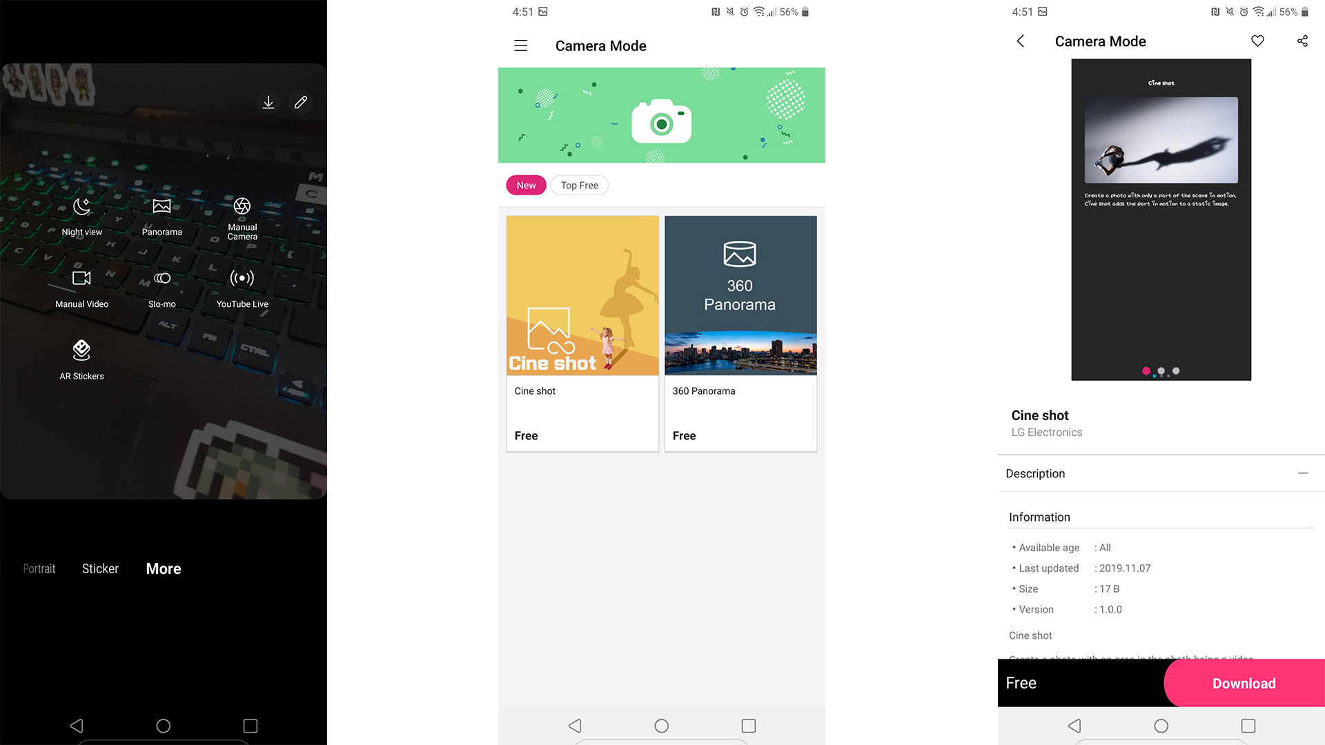 The stock camera app comes with more than half a dozen camera modes, but there are still two more you can add to the mix. Open the camera app, use the carousel to go from Photo mode to More. In the top right corner is a download icon and a pencil icon. Tap the download icon to open LG SmartWorld and download the Cine shot mode and the 360 Panorama mode from there. You can immediately start using them in the camera app when you’re done.