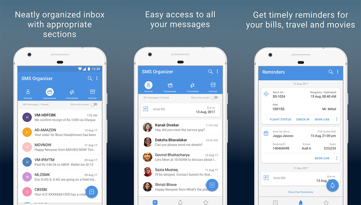 Do not let the name fool you. In addition to text messaging, SMS Organizer surfaces and organizes credit card bills, flight information, promotional texts, and everything in between.