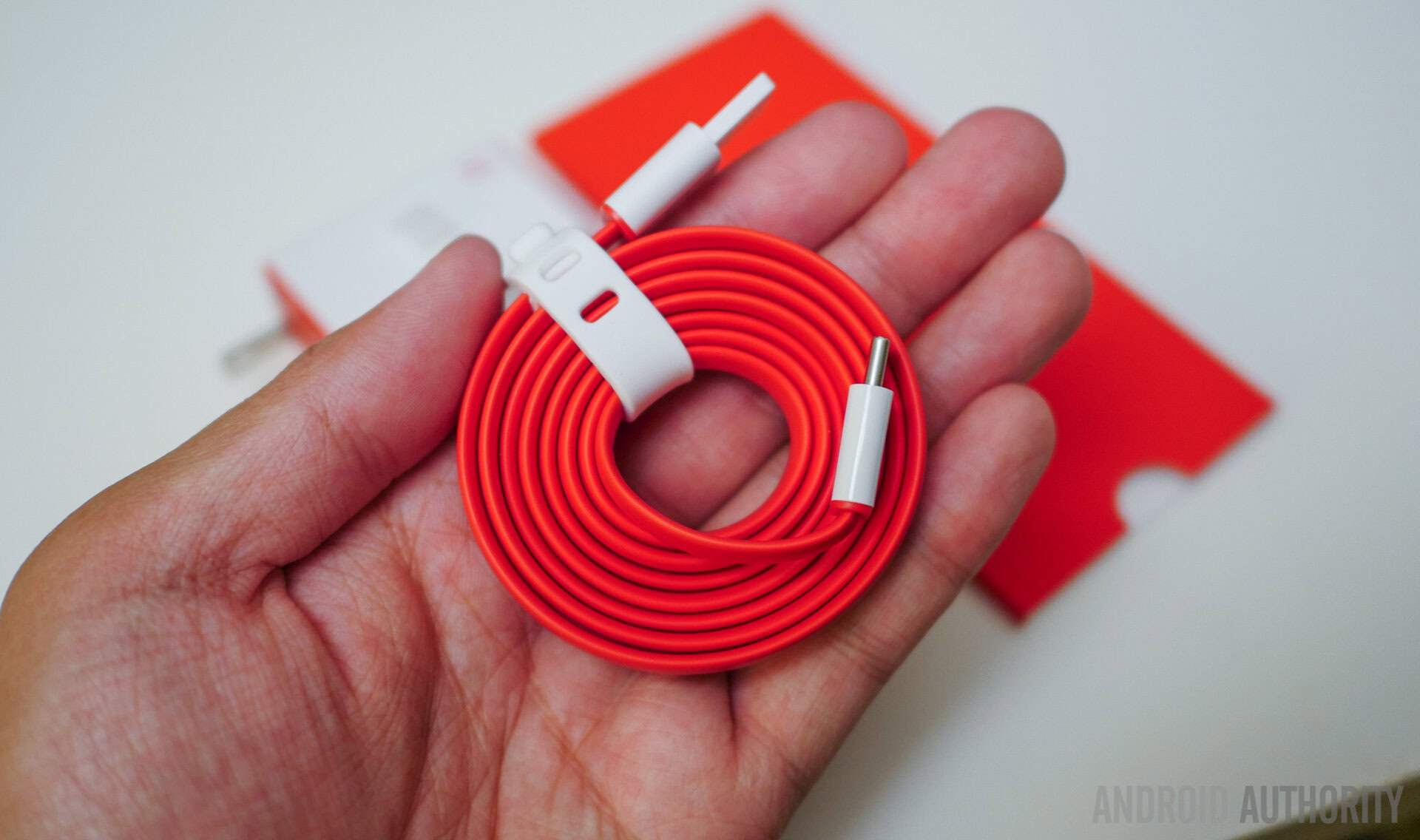 The USB cable it comes in a very similar construction to what we got with the OnePlus, with its flat, tangle-free design and red and white color scheme. The best part about this chord is that it is reversible on either end, so no matter what orientation you plug it into the phone or the USB port, it’ll work, which is fantastic, and takes the guess work out of finding the right way.