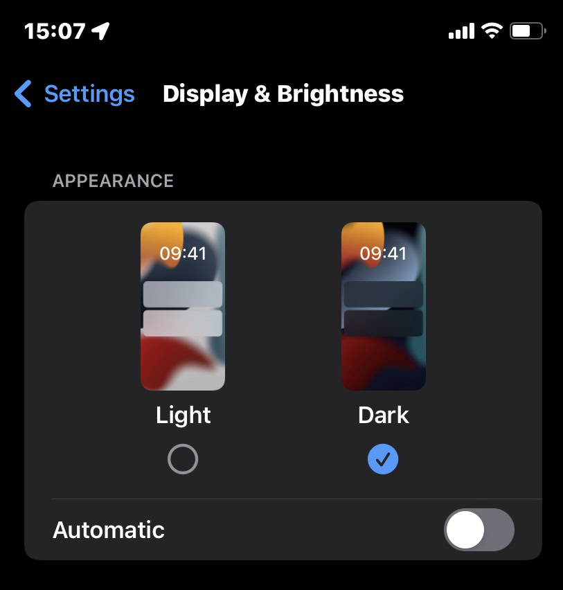 To make your iOS device go into dark mode, go to Settings >Display & Brightness. Tap Dark and your whole device interface will immediately go black. Remember to toggle off Automatic to stop dark mode switching off when it’s daytime outside.