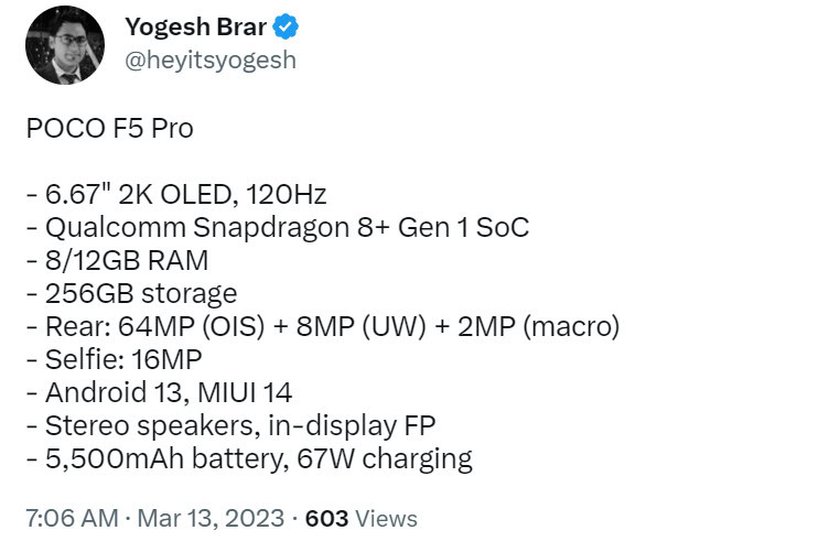 Serial tipster Yogesh Brar has posted apparent Poco F5 Pro specs, and it indeed looks like this is the Redmi K60 with a new name. Check out the specs below.
