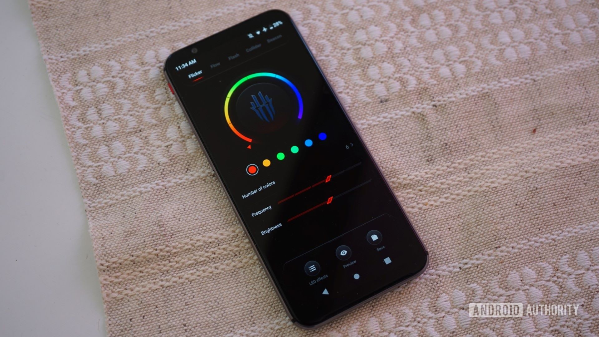 The back of the device has a distinctive design and includes an RGB LED strip. The strip can pull off all kinds of neat effects controlled in the settings, though it isn’t particularly bright during the day. On the sides are the shoulder buttons, a switch for entering Game Space, and a pin connector. Above the LED strip is a traditional fingerprint reader. It proved to be reliable and fast.