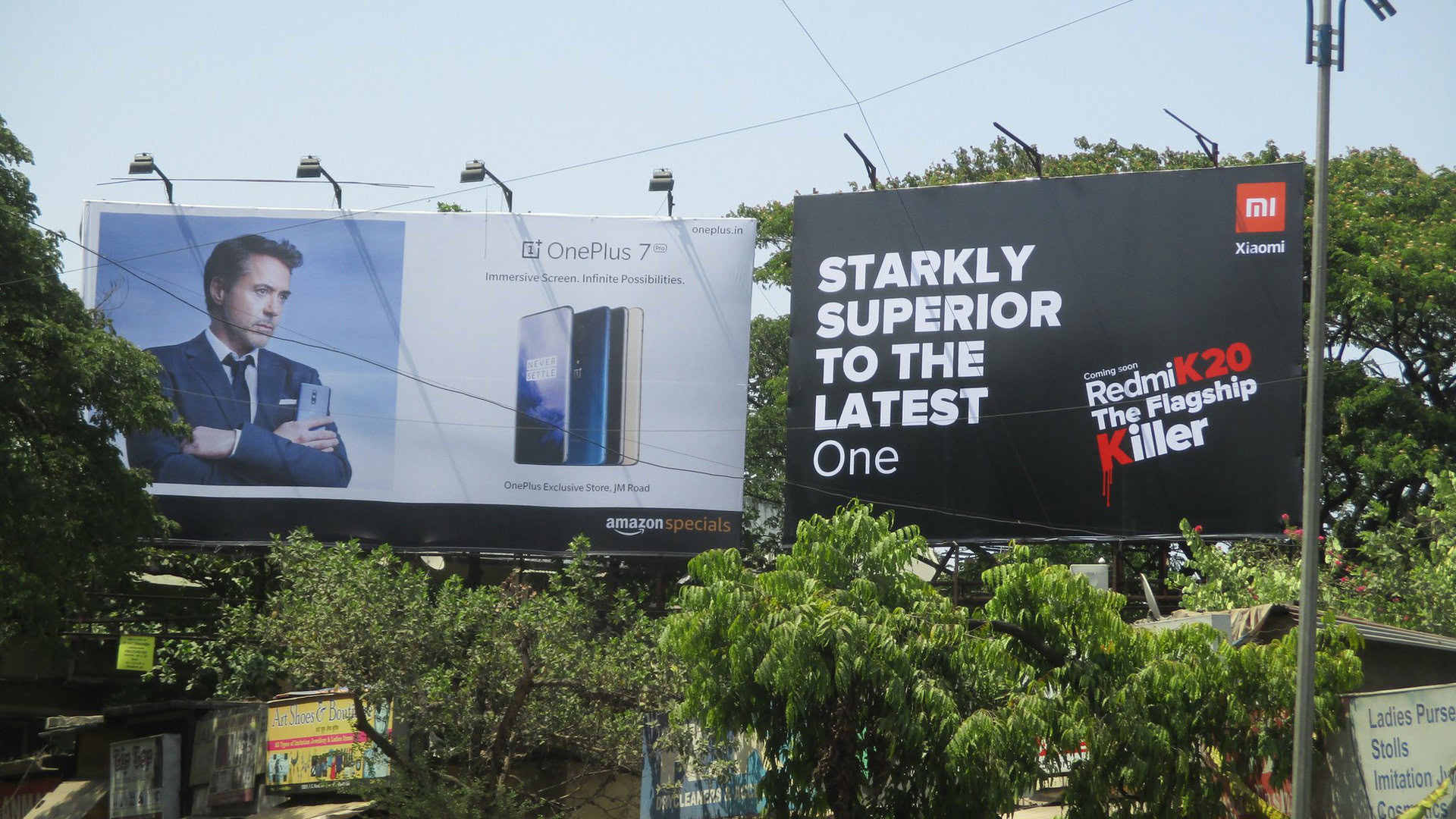 The image above shows an Indian billboard ad for the OnePlus 7 Pro, featuring Robert Downey Jr., the company’s new international spokesperson. Next to that billboard is an ad from Xiaomi that directly digs at OnePlus.