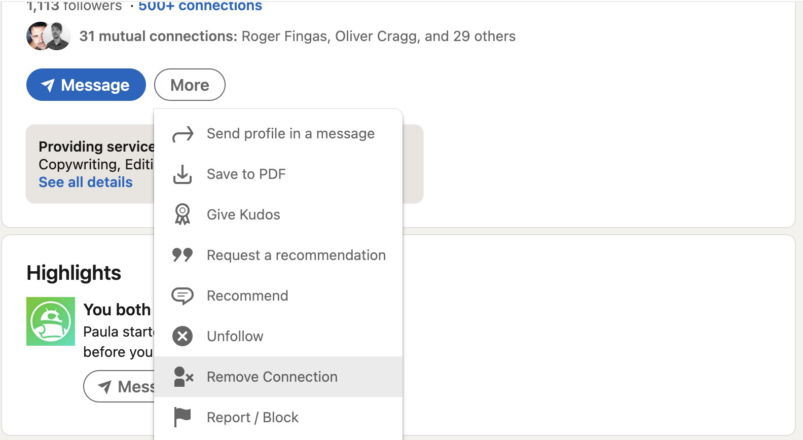 Look for the person that you want to remove and click the three dots to the right of their name. Then click Remove connection. This method is more discreet because you don’t need to go to the person’s actual LinkedIn profile to do this. You’re remaining in your account.