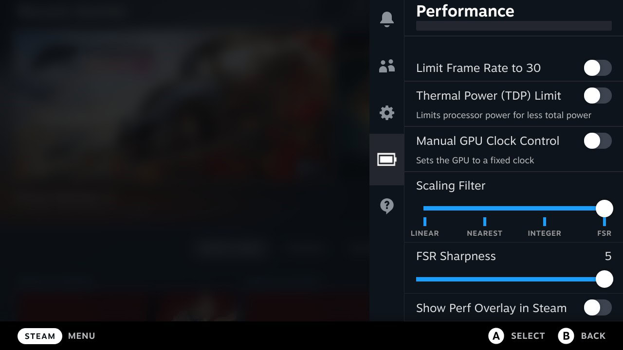 To activate scaling filters on your Steam Deck while in a game, press the Quick Access button and navigate to the Performance tab (represented by a battery icon). Scroll down to Scaling Filter, select one, and adjust FSR sharpness level.