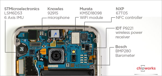 The primary camera model looks to have an STMicroelectronics K2G2IS gyroscope to stabilize the image, and Chipworks further identified a number of other parts during this disassembly. The much-discussed Snapdragon 820 is revealed as the MSM8996, and it appears that Samsung, as expected, has used their own touch screen controller (part number S6SA552X) in the Galaxy S7 Edge.