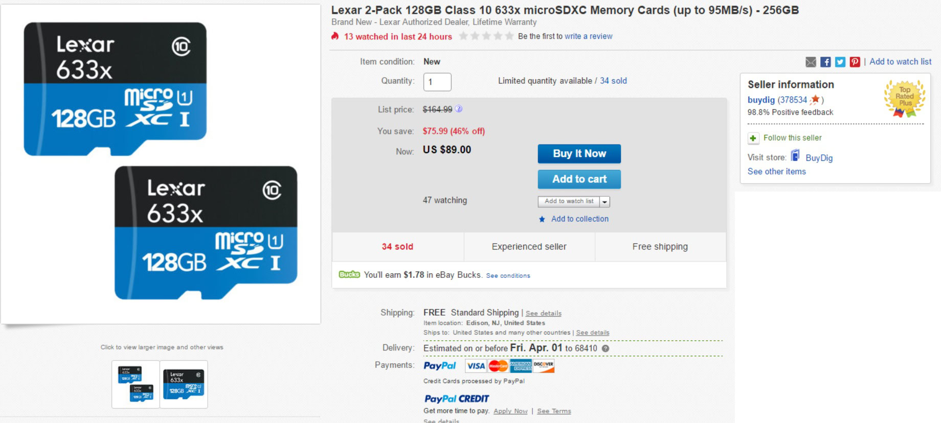 Trusted eBay seller “buydig” is currently offering a 2-pack of 128GB Lexar microSD cards for just $89. There’s also a 2-pack of 64GB cards for $39, if you don’t need as much space. The cards in question are rated Class 10, feature UHS-I technology and have max read speeds of 95MBps. Both 2-packs come with USB 3.0 readers for easily transferring your files from your PC to your mobile device, camera, or whatever have you.