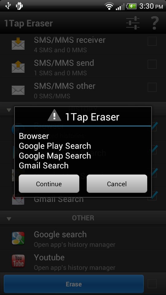 Launch 1Tap Eraser and you can choose what you want to delete by checking it off the app’s list of items. You can clear your apps’ cache, logs for incoming, outgoing and missed calls, received and sent SMS/MMS, your histories (Browser, Google Play Search, Google Map Search and Gmail Search), and even your Google and YouTube searches. Pick a few items to delete by ticking the boxes next to their names or you can delete all of them by ticking the box right next to the blue Erase button at the bottom of the screen.