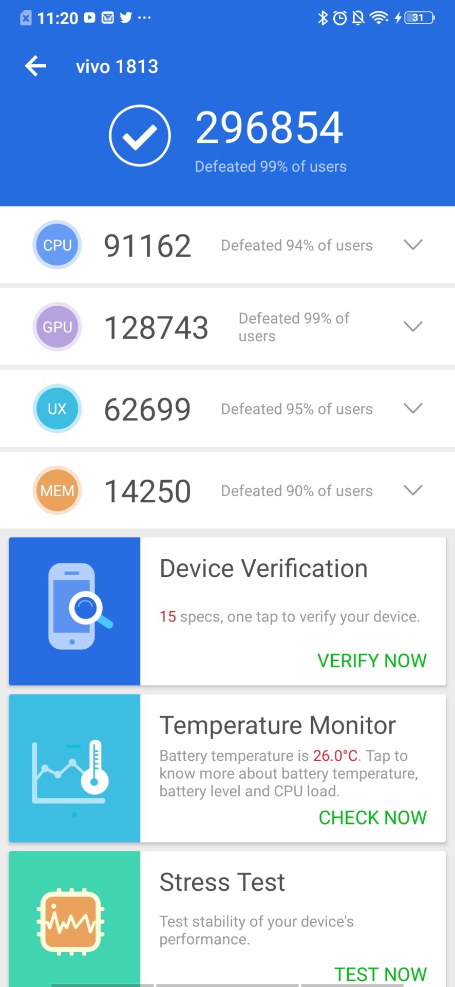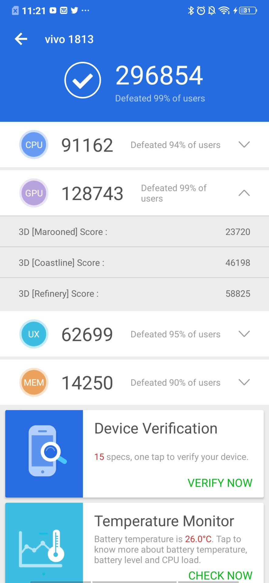 The vivo NEX Dual Display edition scored 296,854 in AnTuTu, compared to the OnePlus 6T’s 262,266 and the Galaxy Note 9’s 272,168.