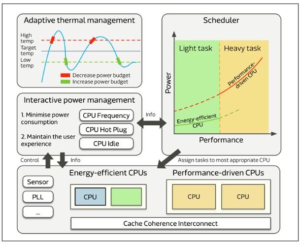 The technology sees multiple CPU cores arranged in high performance and energy efficient clusters, in order to more efficiently balance peak performance with the limited power constrains of a mobile platform. This technology has come into focus in the past year or so, due to the specific battery and thermal limits imposed on mobile SoC designs.