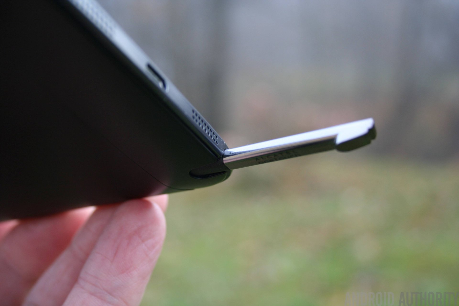 The sides of the phone are aluminium while the back is made of plastic. On the right side is micro SD card tray, the volume rocker and the power button. On the bottom edge are two speaker grills, the micro USB port, and the stylus holder. There is nothing on the left hand side save for the SIM card tray. On the top is the headphone jack and the IR blaster. The left hand side is intentionally sparse as it leaves room for the MagicFlip covers.