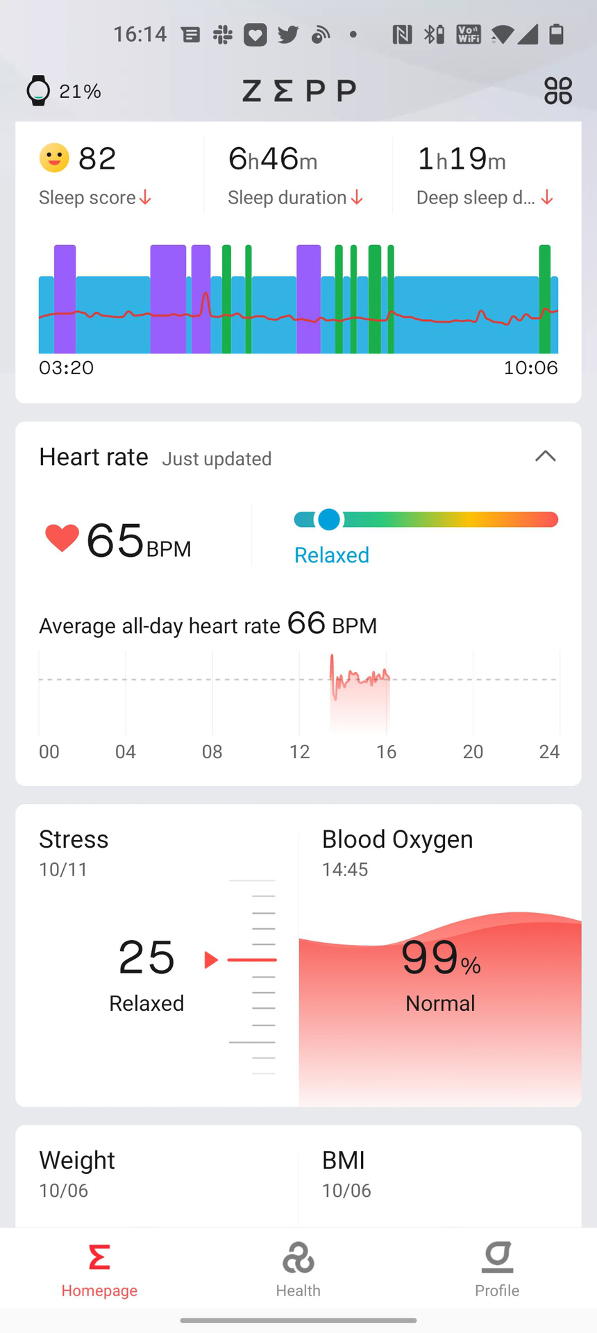 - Stress monitoring: The watch can capture stress levels by measuring variations in your heart rate. I’m a bit skeptical of this feature since it never really inched beyond “relaxed” despite having a somewhat stressful week. There’s no real way to view barebones heart rate variability data either, though I suppose you could always dive into the heart rate section to do a spot check on heart rate measurements over the course of the day. Regardless, I wouldn’t put too much weight behind Amazfit’s stress measurements.