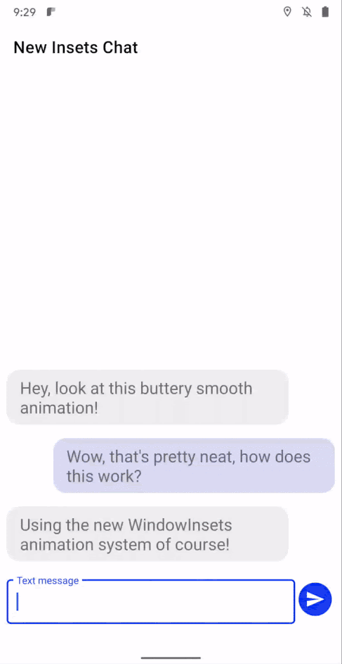 - Synchronized IME transitions: Google is introducing a new set of APIs that let you sync your app’s content with the onscreen keyboard and system bars as they animate on and offscreen. This will hopefully allow devs to create more natural, intuitive, and “jank-free” IME transitions. Take a look at the GIFs below to see it in action.