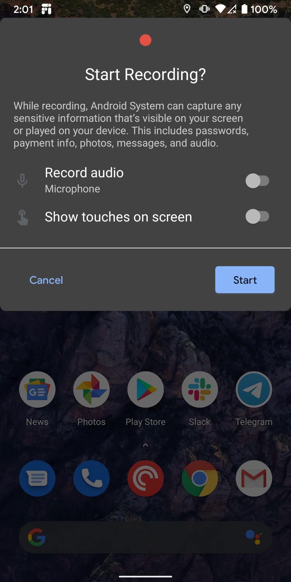 We first saw a glimpse of this feature in the first Android 11 Developer Preview, but now we’ve got a full-fledged, working recorder. When you launch the feature, you’re given the option to record audio alongside the recording or show touches. This is really useful when you’re trying to show someone how to do something on their phone.