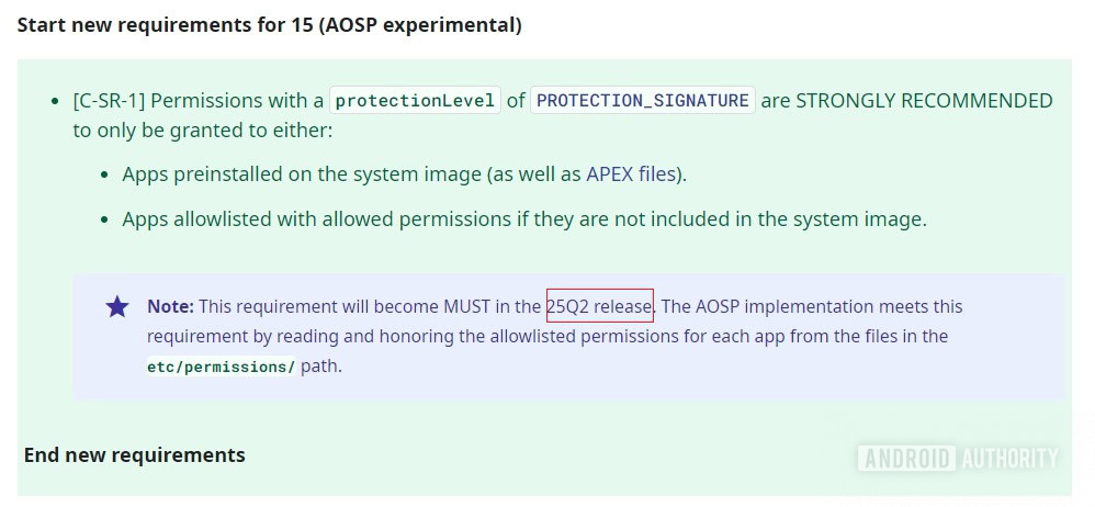 While I was pouring over the Compatibility Definition Document (CDD) for Android 15, I noticed that Google twice referred to “25Q2” as the next release of Android. The reason this caught my attention is because under the normal release cycle, we’d be expecting the next version of Android more in 25Q3.