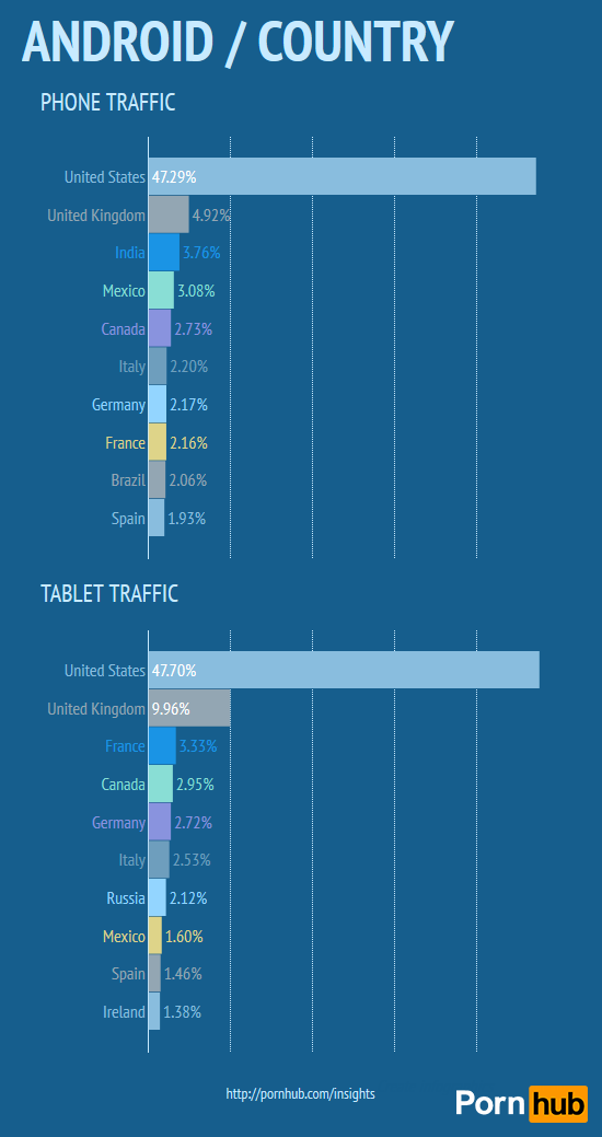 - Pornhub’s Android traffic from the United States is nearly identical for both phones and tablets at 47%. The United Kingdom takes spot number 2, but is nearly double on tablet (10%) versus phone (5%). India is Android’s number 3 spot on phone but doesn’t make the top 10 on Android tablets.