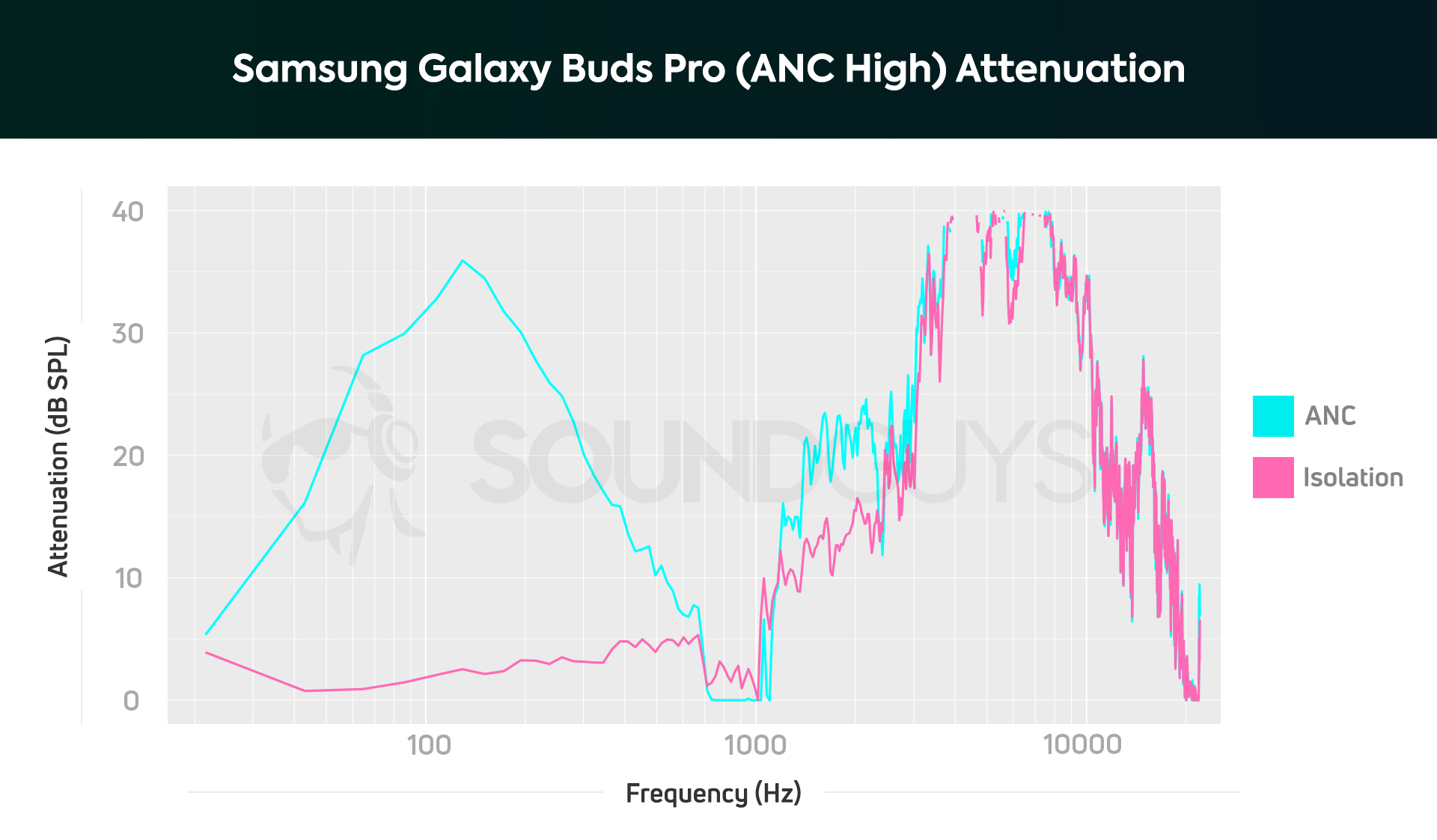 Passive isolation is also better with the Samsung Galaxy Buds; this affects sounds higher than 1000Hz, which is often referred to as incidental noise. This is where things like clanging dishware and sharp laughs fall. Bear in mind, these charts depict performance in the ideal situation (e.g., a controlled environment where we make sure the ear tips seal to the test ear canals properly), so you real-world mileage may vary a bit.