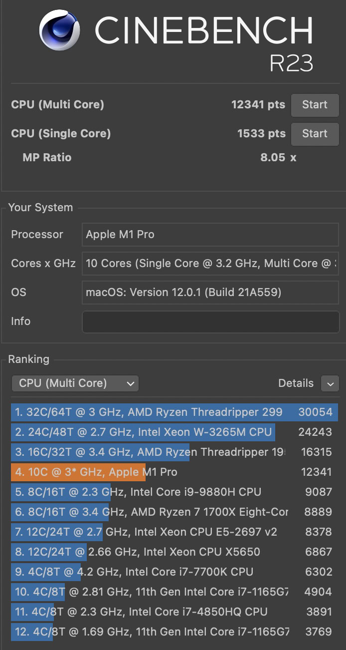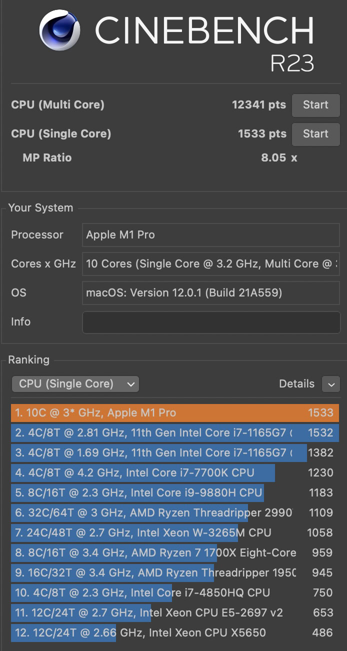 In Geekbench 5, the 10-core M1 Pro scored 1,774 for single-core and 12,596 for multi-threaded performance. This is a great multi-thread result compared not only to the M1 but basically all PC laptops. The M1 Pro posted scores in Cinebench R23 of 1,533 for single-core and 12,341 for multi-core. 3DMark had similarly great results of 10,404 (62.3fps) in Wild Life Extreme Unlimited. In our custom Speed Test G PC benchmark the M1 Pro clocked 52 seconds, undercutting the M1 chip’s 56 seconds (note that it’s a CPU-only benchmark so does not test GPU performance).