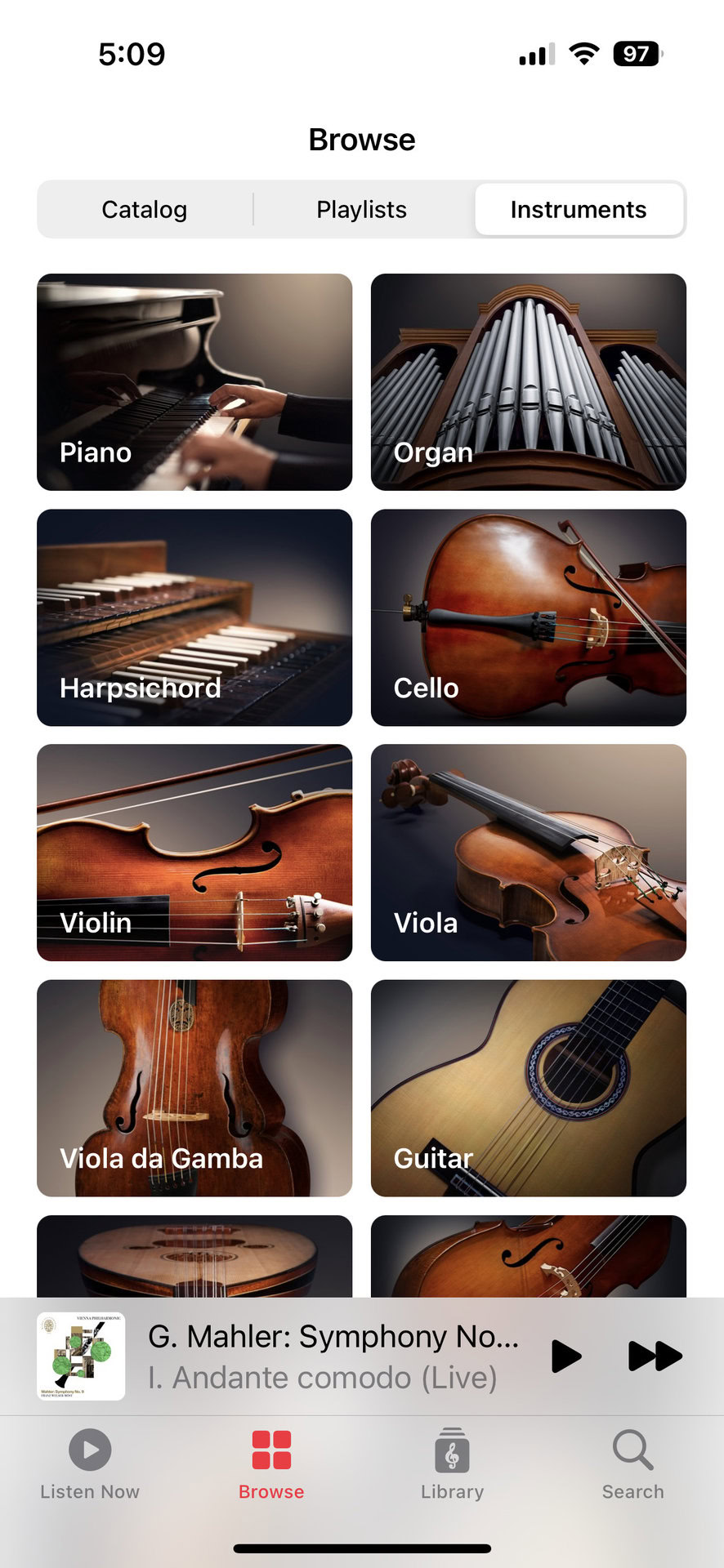 Prefer something even more fine-tuned? Swipe right to the instruments tab; the app lets you get into the weeds with guitars, harpsichords, pianos, and more. It’s designed for listeners who want to get intimate with their music.