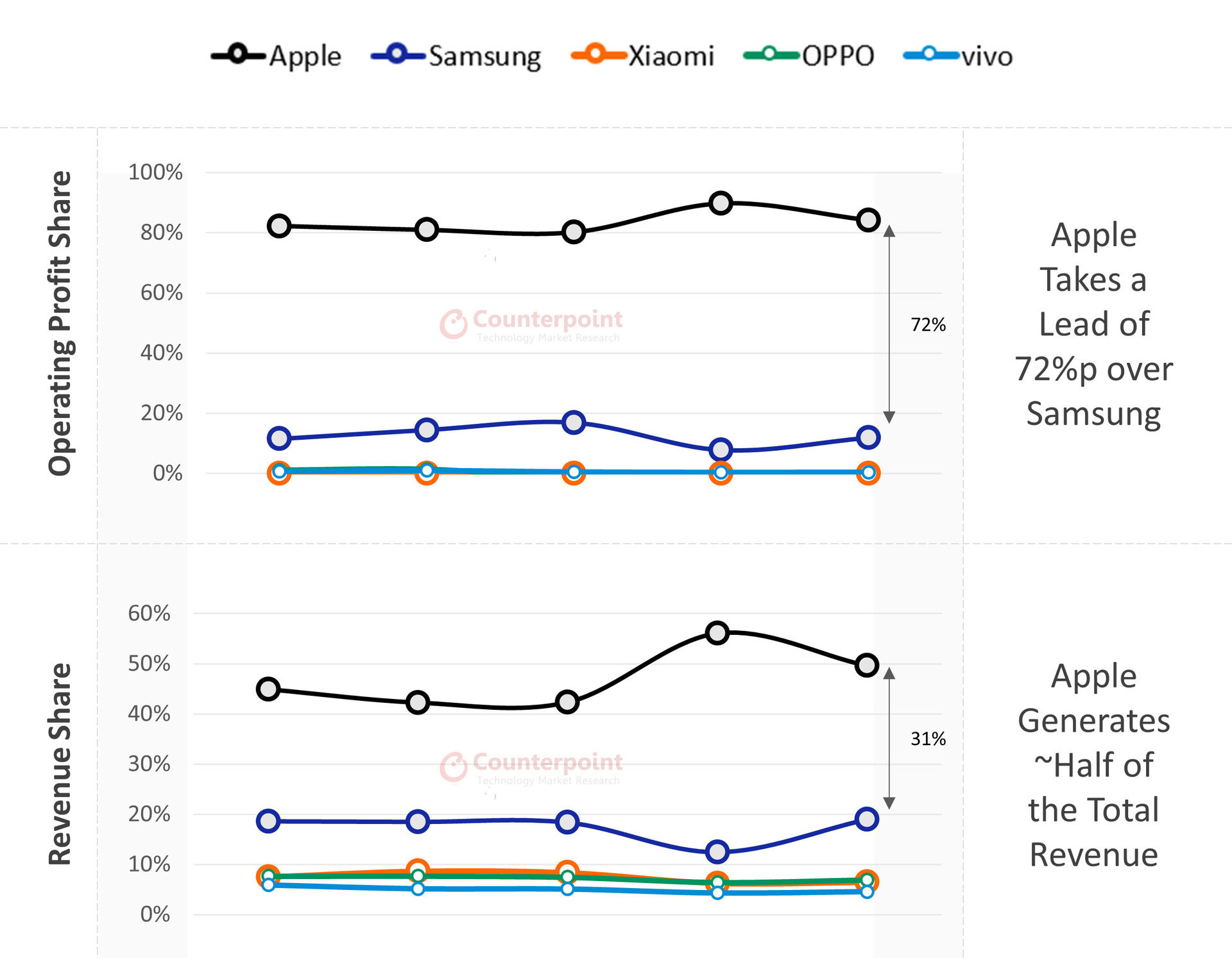 OPPO and vivo completed the top five, accounting for ~10% and ~7% of the market respectively. However, things get pretty interesting when we look at the manufacturers making the most money.