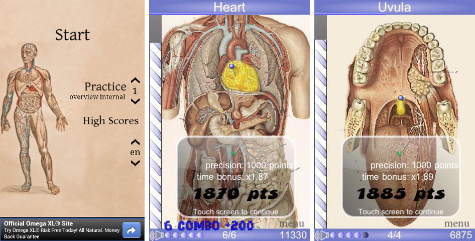 The faster and more precise you can point to a liver, a gallbladder or an incisor, the more points you earn. When you hold your finger over an image, a magnifying glass appears which allows you to achieve more precision and higher scores.